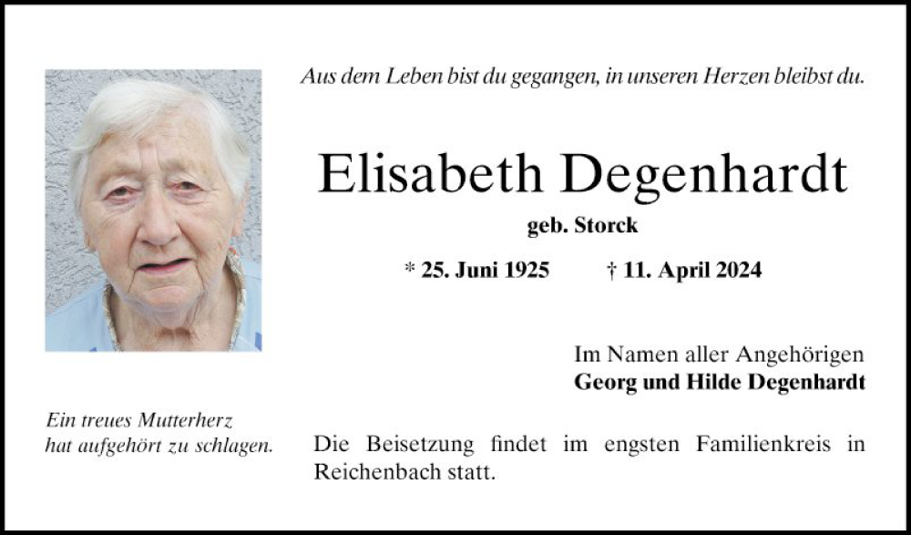Hier finden Sie alle Traueranzeigen aus der Zeitung, die bisher für Elisabeth Degenhardt erschienen sind. Weitere Traueranzeigen, die in der Zeitung erscheinen, werden hier ebenfalls aufgelistet