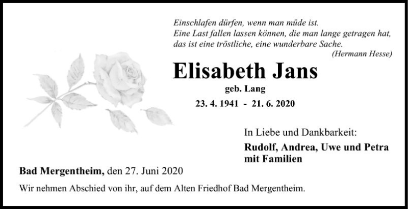 Hier finden Sie alle Traueranzeigen aus der Zeitung, die bisher für Elisabeth Jans erschienen sind. Weitere Traueranzeigen, die in der Zeitung erscheinen, werden hier ebenfalls aufgelistet