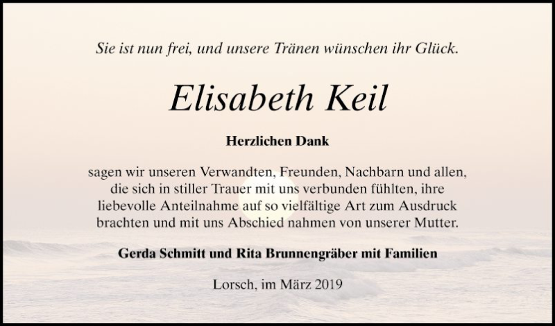 Hier finden Sie alle Traueranzeigen aus der Zeitung, die bisher für Elisabeth Keil erschienen sind. Weitere Traueranzeigen, die in der Zeitung erscheinen, werden hier ebenfalls aufgelistet