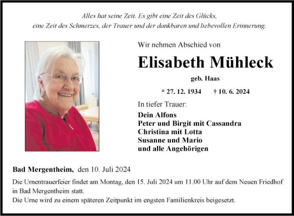 Hier finden Sie alle Traueranzeigen aus der Zeitung, die bisher für Elisabeth Mühleck erschienen sind. Weitere Traueranzeigen, die in der Zeitung erscheinen, werden hier ebenfalls aufgelistet