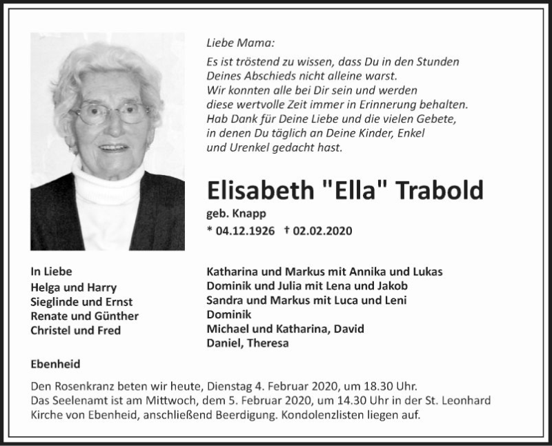 Hier finden Sie alle Traueranzeigen aus der Zeitung, die bisher für Elisabeth Trabold erschienen sind. Weitere Traueranzeigen, die in der Zeitung erscheinen, werden hier ebenfalls aufgelistet