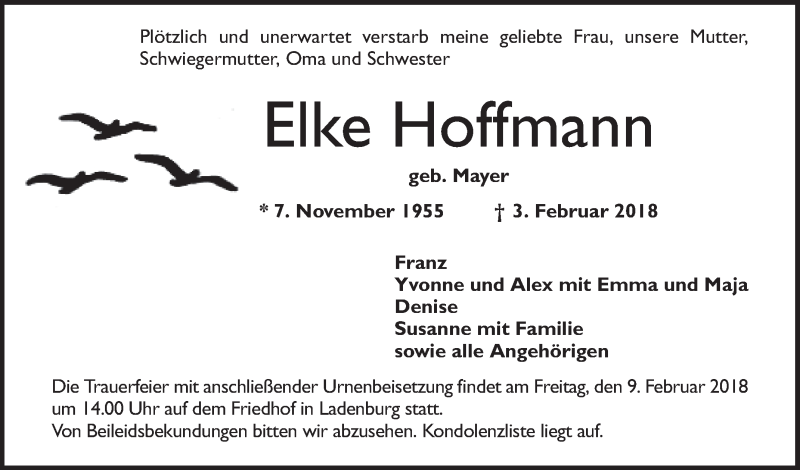 Hier finden Sie alle Traueranzeigen aus der Zeitung, die bisher für Elke Hoffmann erschienen sind. Weitere Traueranzeigen, die in der Zeitung erscheinen, werden hier ebenfalls aufgelistet