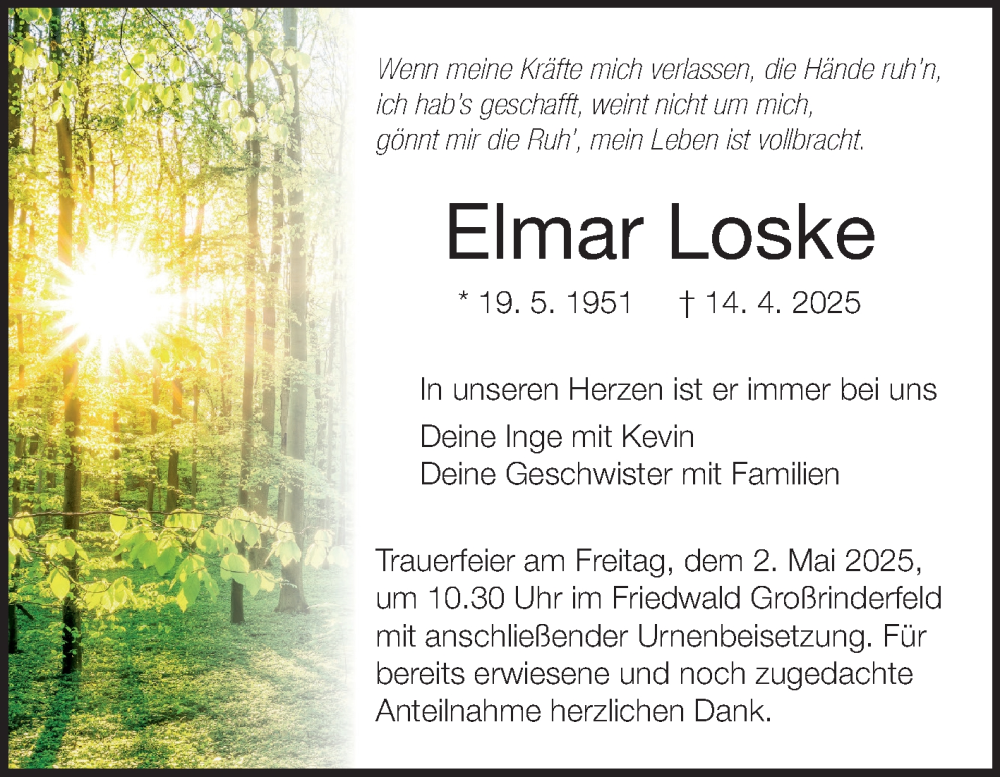 Hier finden Sie alle Traueranzeigen aus der Zeitung, die bisher für Elmar Loske erschienen sind. Weitere Traueranzeigen, die in der Zeitung erscheinen, werden hier ebenfalls aufgelistet