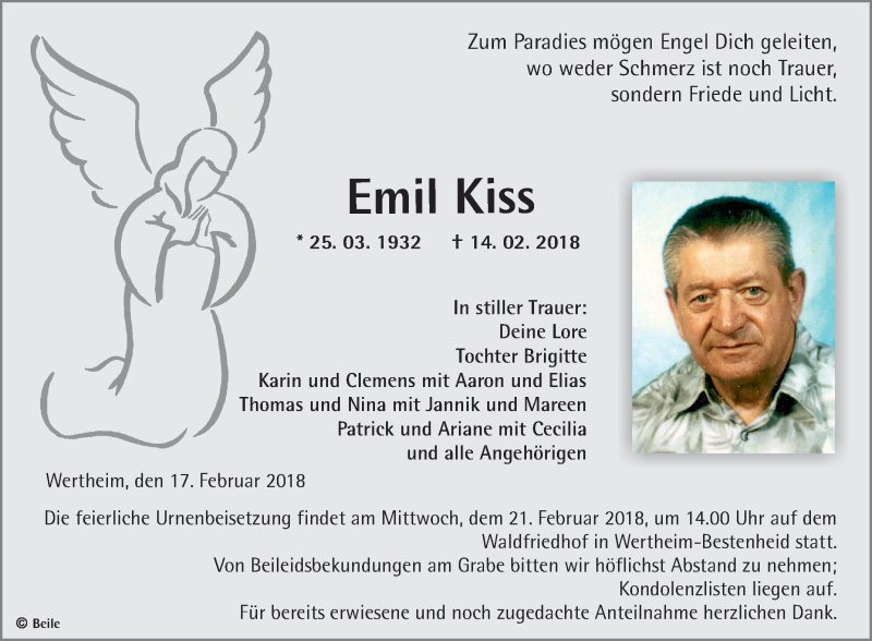 Hier finden Sie alle Traueranzeigen aus der Zeitung, die bisher für Emil Kiss erschienen sind. Weitere Traueranzeigen, die in der Zeitung erscheinen, werden hier ebenfalls aufgelistet