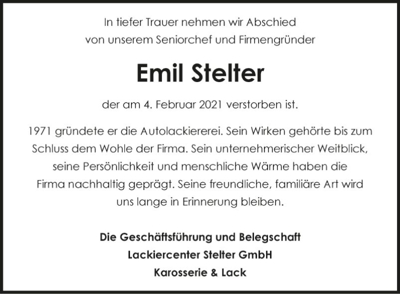Hier finden Sie alle Traueranzeigen aus der Zeitung, die bisher für Emil Stelter erschienen sind. Weitere Traueranzeigen, die in der Zeitung erscheinen, werden hier ebenfalls aufgelistet