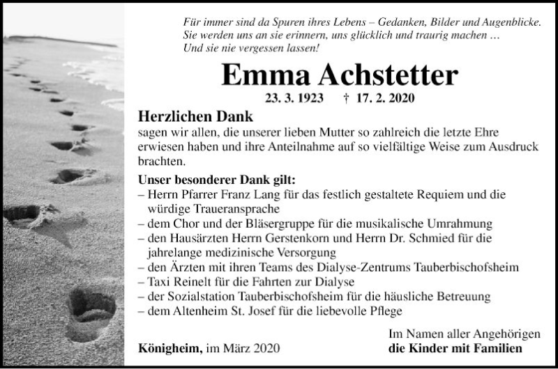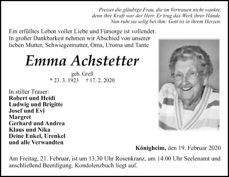 Hier finden Sie alle Traueranzeigen aus der Zeitung, die bisher für Emma Achstetter erschienen sind. Weitere Traueranzeigen, die in der Zeitung erscheinen, werden hier ebenfalls aufgelistet