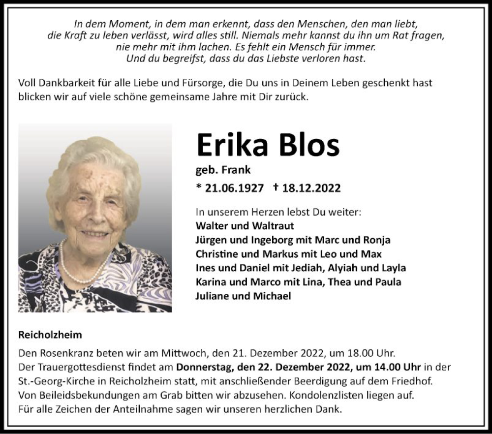 Hier finden Sie alle Traueranzeigen aus der Zeitung, die bisher für Erika Blos erschienen sind. Weitere Traueranzeigen, die in der Zeitung erscheinen, werden hier ebenfalls aufgelistet
