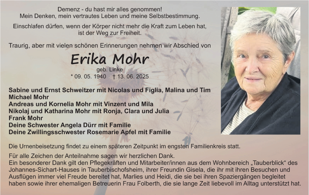 Hier finden Sie alle Traueranzeigen aus der Zeitung, die bisher für Erika Mohr erschienen sind. Weitere Traueranzeigen, die in der Zeitung erscheinen, werden hier ebenfalls aufgelistet