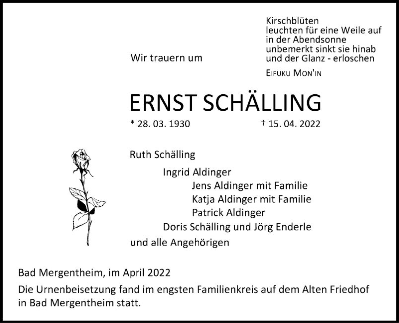 Hier finden Sie alle Traueranzeigen aus der Zeitung, die bisher für Ernst Schälling erschienen sind. Weitere Traueranzeigen, die in der Zeitung erscheinen, werden hier ebenfalls aufgelistet