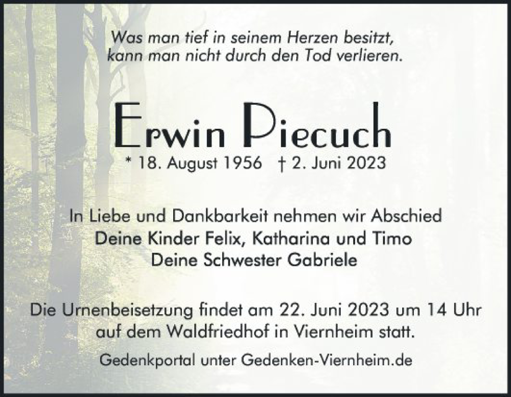 Hier finden Sie alle Traueranzeigen aus der Zeitung, die bisher für Erwin Piecuch erschienen sind. Weitere Traueranzeigen, die in der Zeitung erscheinen, werden hier ebenfalls aufgelistet