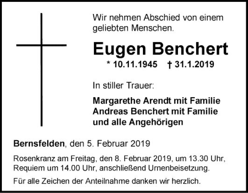 Hier finden Sie alle Traueranzeigen aus der Zeitung, die bisher für Eugen Benchert erschienen sind. Weitere Traueranzeigen, die in der Zeitung erscheinen, werden hier ebenfalls aufgelistet