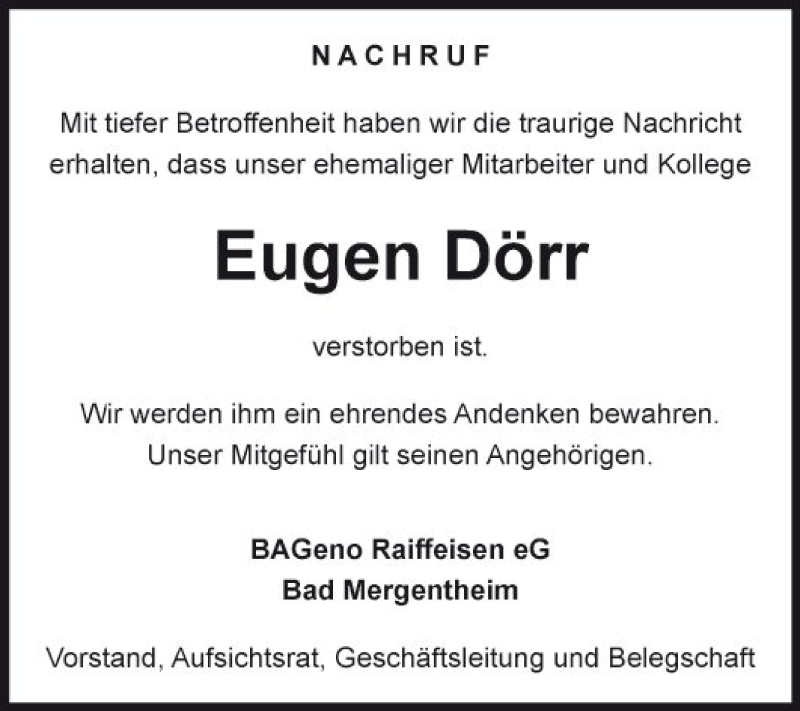 Hier finden Sie alle Traueranzeigen aus der Zeitung, die bisher für Eugen Dörr erschienen sind. Weitere Traueranzeigen, die in der Zeitung erscheinen, werden hier ebenfalls aufgelistet