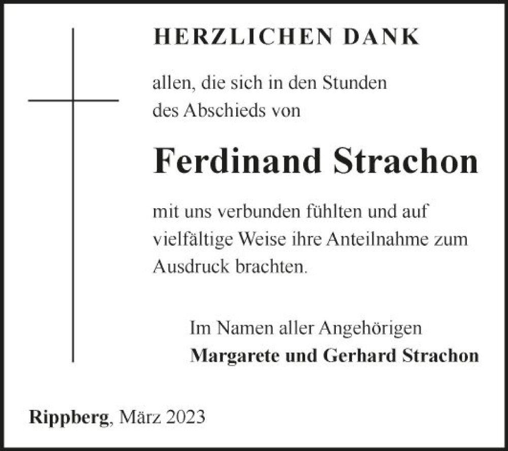 Hier finden Sie alle Traueranzeigen aus der Zeitung, die bisher für Ferdinand Strachon erschienen sind. Weitere Traueranzeigen, die in der Zeitung erscheinen, werden hier ebenfalls aufgelistet