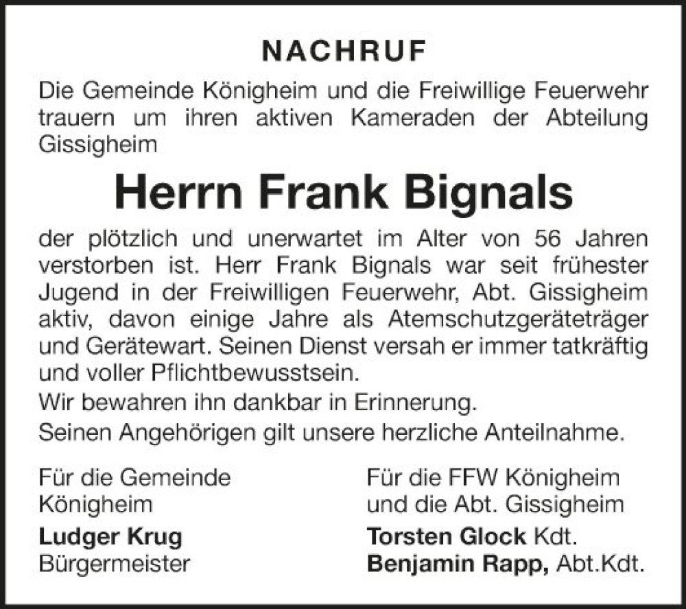 Hier finden Sie alle Traueranzeigen aus der Zeitung, die bisher für Frank Bignals erschienen sind. Weitere Traueranzeigen, die in der Zeitung erscheinen, werden hier ebenfalls aufgelistet