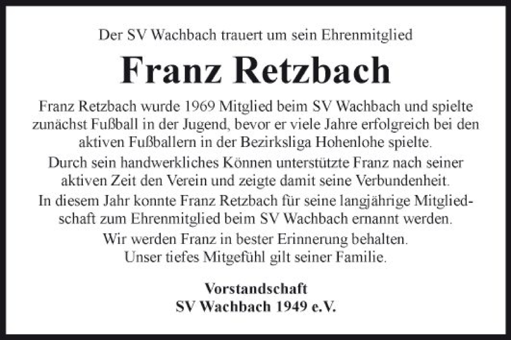 Hier finden Sie alle Traueranzeigen aus der Zeitung, die bisher für Franz Retzbach erschienen sind. Weitere Traueranzeigen, die in der Zeitung erscheinen, werden hier ebenfalls aufgelistet