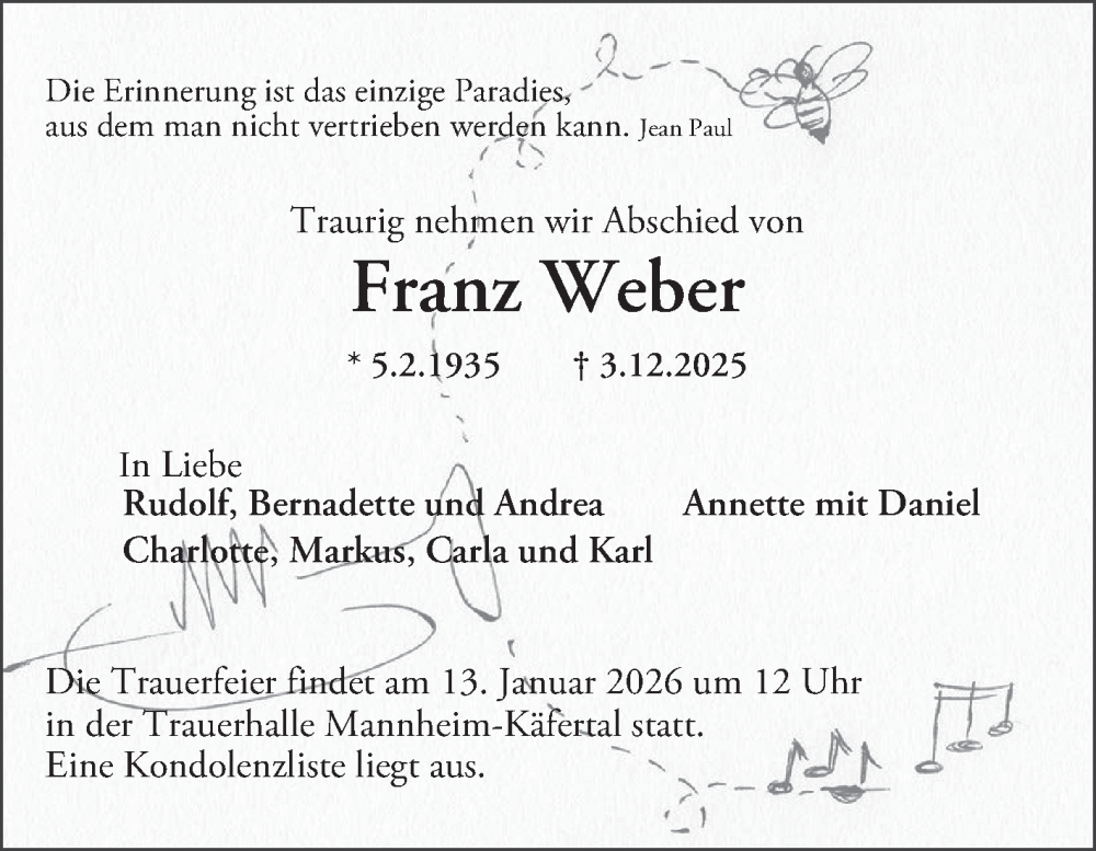 Hier finden Sie alle Traueranzeigen aus der Zeitung, die bisher für Franz Weber erschienen sind. Weitere Traueranzeigen, die in der Zeitung erscheinen, werden hier ebenfalls aufgelistet