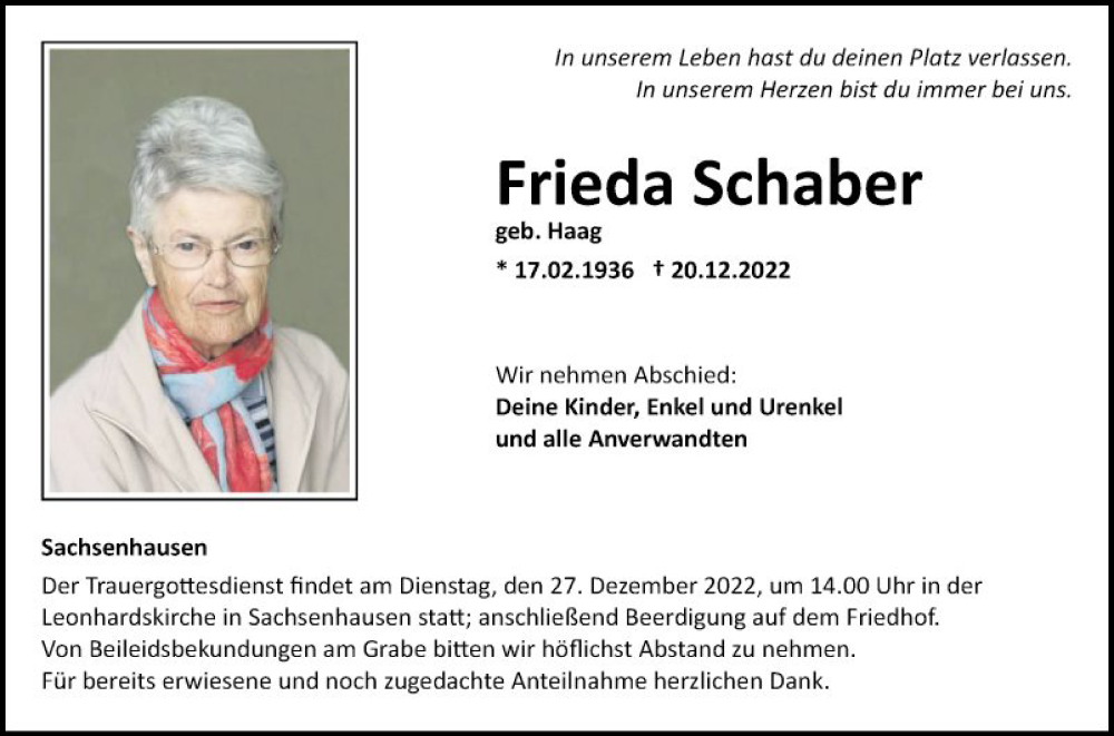 Hier finden Sie alle Traueranzeigen aus der Zeitung, die bisher für Frieda Schaber erschienen sind. Weitere Traueranzeigen, die in der Zeitung erscheinen, werden hier ebenfalls aufgelistet