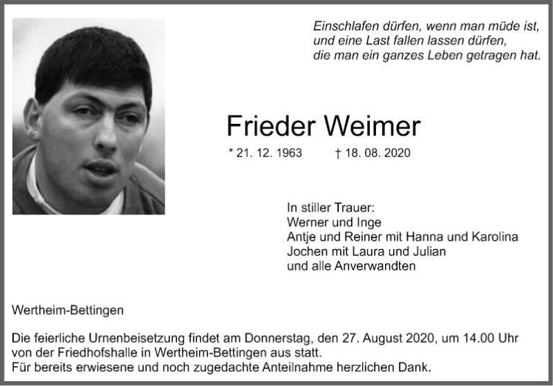 Hier finden Sie alle Traueranzeigen aus der Zeitung, die bisher für Frieder Weimer erschienen sind. Weitere Traueranzeigen, die in der Zeitung erscheinen, werden hier ebenfalls aufgelistet