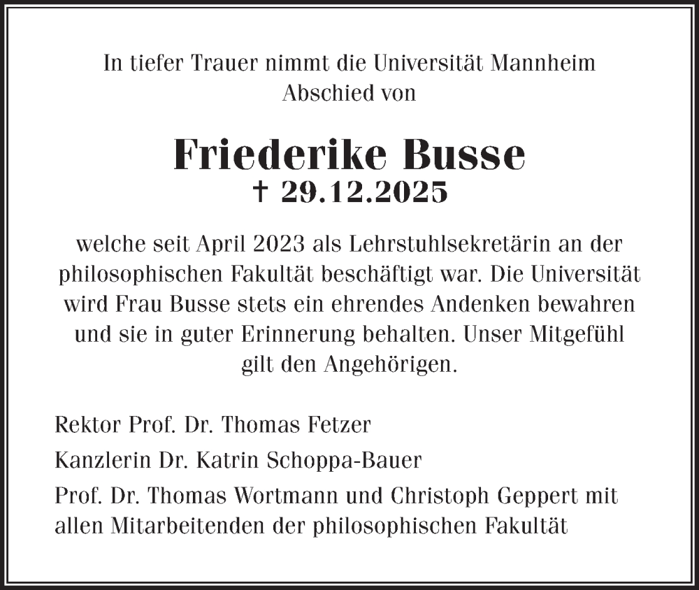 Hier finden Sie alle Traueranzeigen aus der Zeitung, die bisher für Friederike Busse erschienen sind. Weitere Traueranzeigen, die in der Zeitung erscheinen, werden hier ebenfalls aufgelistet