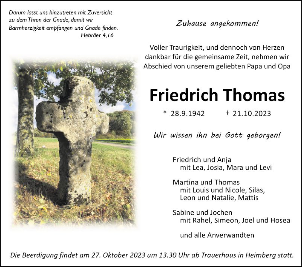 Hier finden Sie alle Traueranzeigen aus der Zeitung, die bisher für Friedrich Thomas erschienen sind. Weitere Traueranzeigen, die in der Zeitung erscheinen, werden hier ebenfalls aufgelistet