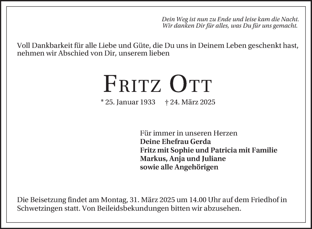 Hier finden Sie alle Traueranzeigen aus der Zeitung, die bisher für Fritz Ott erschienen sind. Weitere Traueranzeigen, die in der Zeitung erscheinen, werden hier ebenfalls aufgelistet