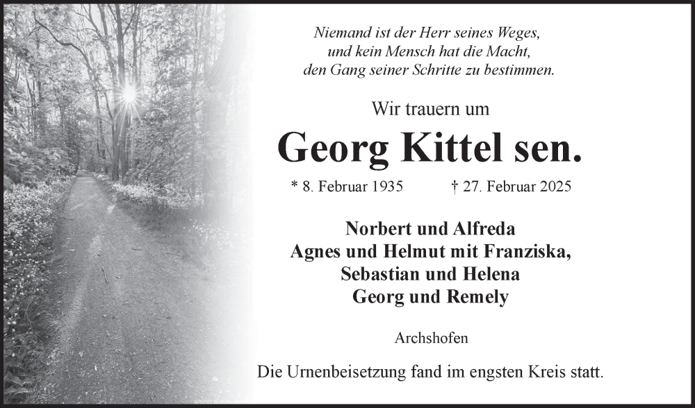 Hier finden Sie alle Traueranzeigen aus der Zeitung, die bisher für Georg Kittel erschienen sind. Weitere Traueranzeigen, die in der Zeitung erscheinen, werden hier ebenfalls aufgelistet