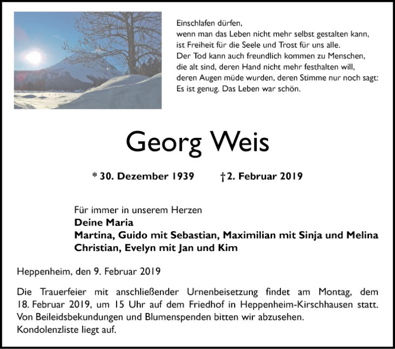 Hier finden Sie alle Traueranzeigen aus der Zeitung, die bisher für Georg Weis erschienen sind. Weitere Traueranzeigen, die in der Zeitung erscheinen, werden hier ebenfalls aufgelistet