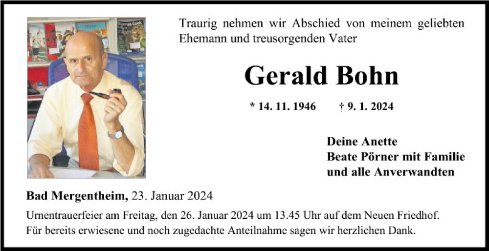 Hier finden Sie alle Traueranzeigen aus der Zeitung, die bisher für Gerald Bohn erschienen sind. Weitere Traueranzeigen, die in der Zeitung erscheinen, werden hier ebenfalls aufgelistet