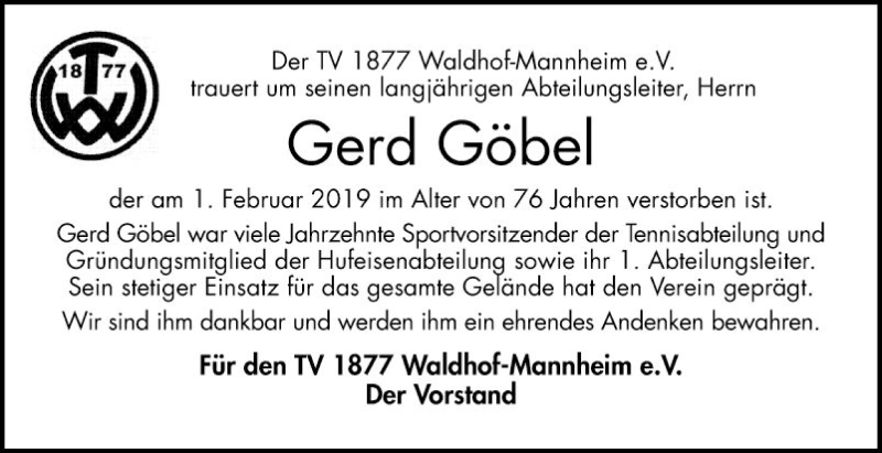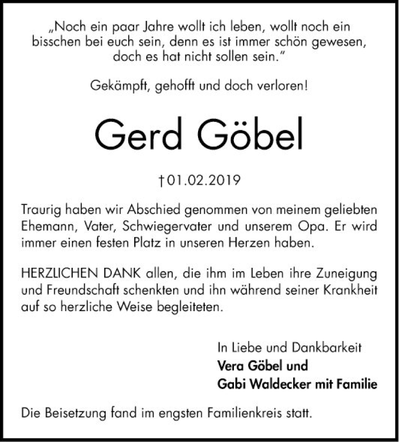 Hier finden Sie alle Traueranzeigen aus der Zeitung, die bisher für Gerd Göbel erschienen sind. Weitere Traueranzeigen, die in der Zeitung erscheinen, werden hier ebenfalls aufgelistet