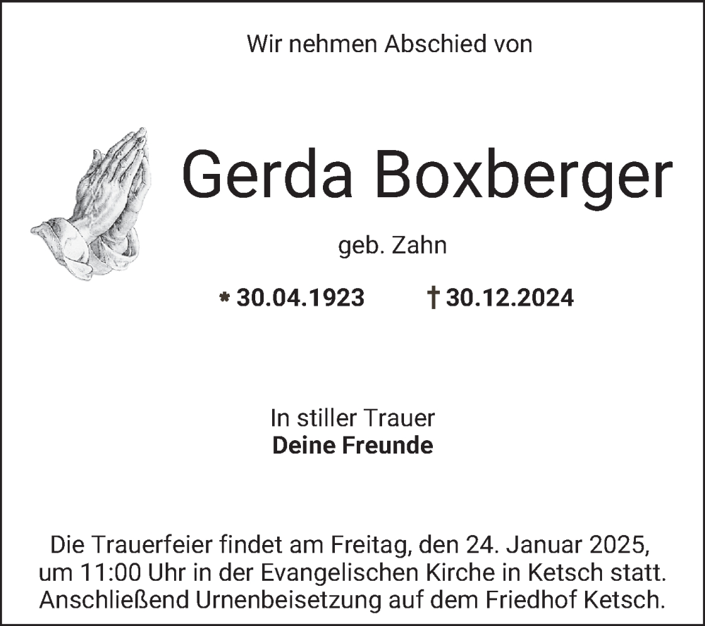 Hier finden Sie alle Traueranzeigen aus der Zeitung, die bisher für Gerda Boxberger erschienen sind. Weitere Traueranzeigen, die in der Zeitung erscheinen, werden hier ebenfalls aufgelistet