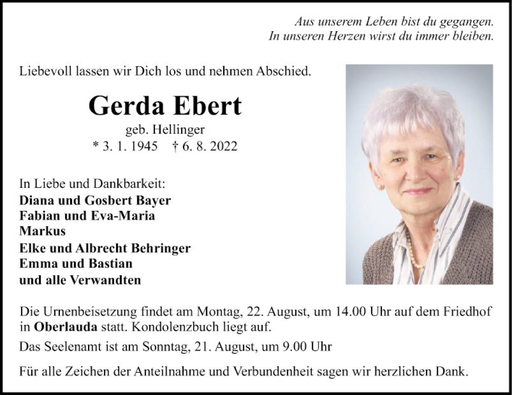 Hier finden Sie alle Traueranzeigen aus der Zeitung, die bisher für Gerda Ebert erschienen sind. Weitere Traueranzeigen, die in der Zeitung erscheinen, werden hier ebenfalls aufgelistet