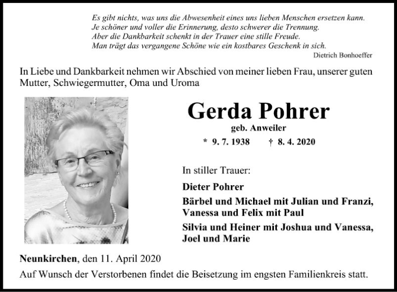 Hier finden Sie alle Traueranzeigen aus der Zeitung, die bisher für Gerda Pohrer erschienen sind. Weitere Traueranzeigen, die in der Zeitung erscheinen, werden hier ebenfalls aufgelistet