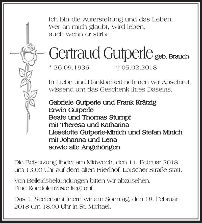Hier finden Sie alle Traueranzeigen aus der Zeitung, die bisher für Gertraud Gutperle erschienen sind. Weitere Traueranzeigen, die in der Zeitung erscheinen, werden hier ebenfalls aufgelistet