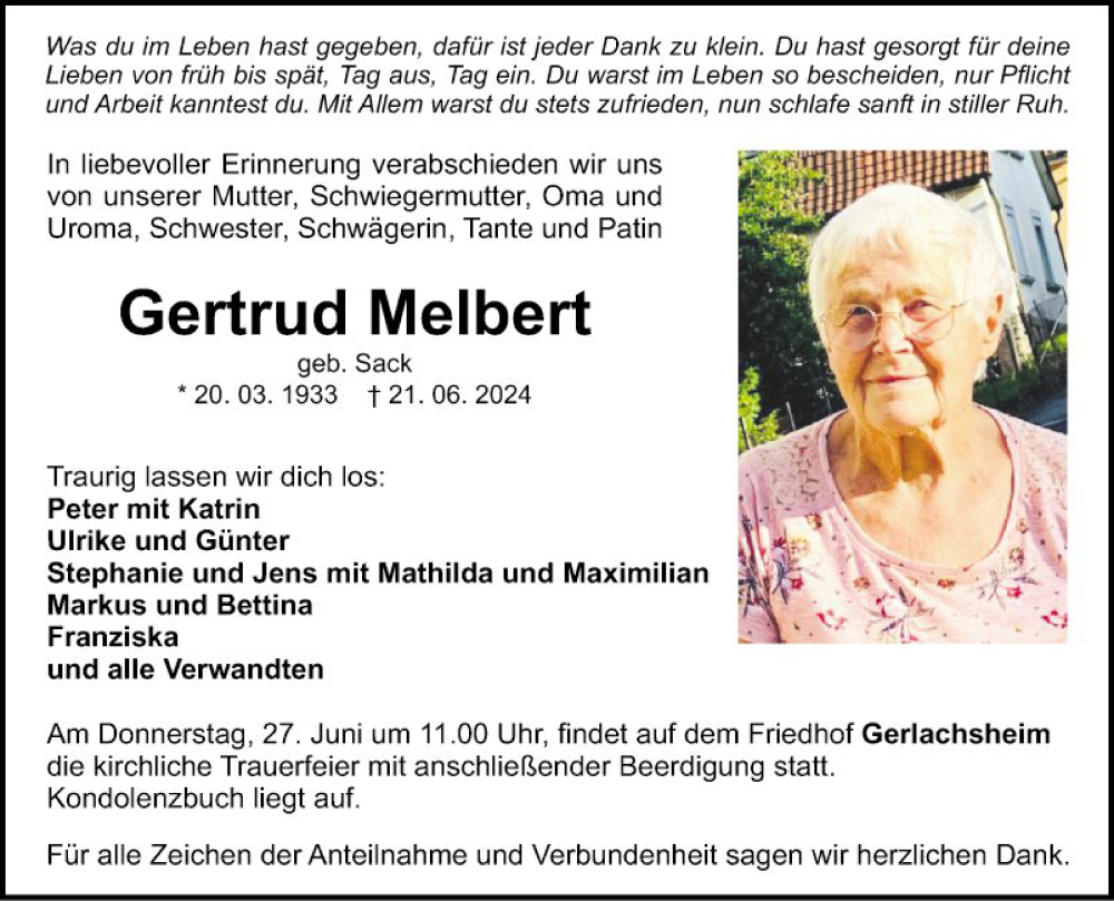 Hier finden Sie alle Traueranzeigen aus der Zeitung, die bisher für Gertrud Melbert erschienen sind. Weitere Traueranzeigen, die in der Zeitung erscheinen, werden hier ebenfalls aufgelistet