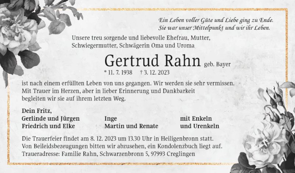 Hier finden Sie alle Traueranzeigen aus der Zeitung, die bisher für Gertrud Rahn erschienen sind. Weitere Traueranzeigen, die in der Zeitung erscheinen, werden hier ebenfalls aufgelistet