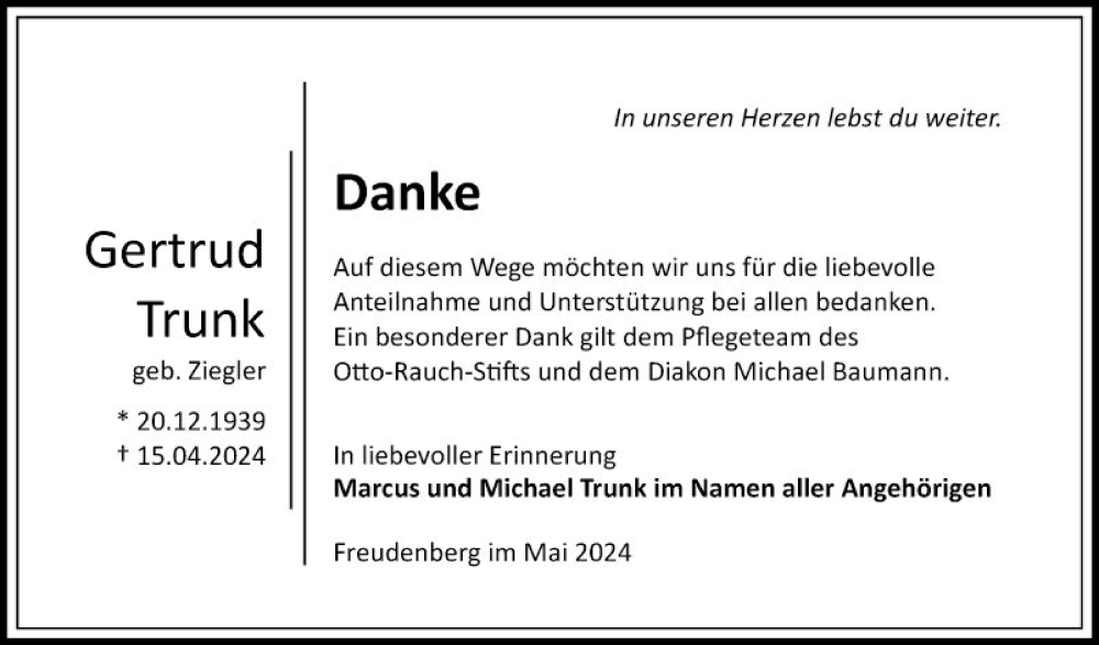 Hier finden Sie alle Traueranzeigen aus der Zeitung, die bisher für Gertrud Trunk erschienen sind. Weitere Traueranzeigen, die in der Zeitung erscheinen, werden hier ebenfalls aufgelistet