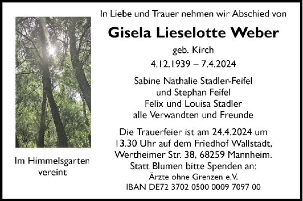 Hier finden Sie alle Traueranzeigen aus der Zeitung, die bisher für Gisela Lieselotte Weber erschienen sind. Weitere Traueranzeigen, die in der Zeitung erscheinen, werden hier ebenfalls aufgelistet