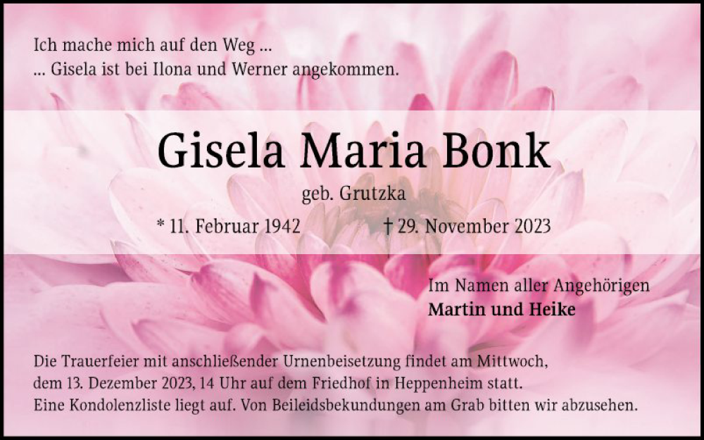 Hier finden Sie alle Traueranzeigen aus der Zeitung, die bisher für Gisela Maria Bonk erschienen sind. Weitere Traueranzeigen, die in der Zeitung erscheinen, werden hier ebenfalls aufgelistet