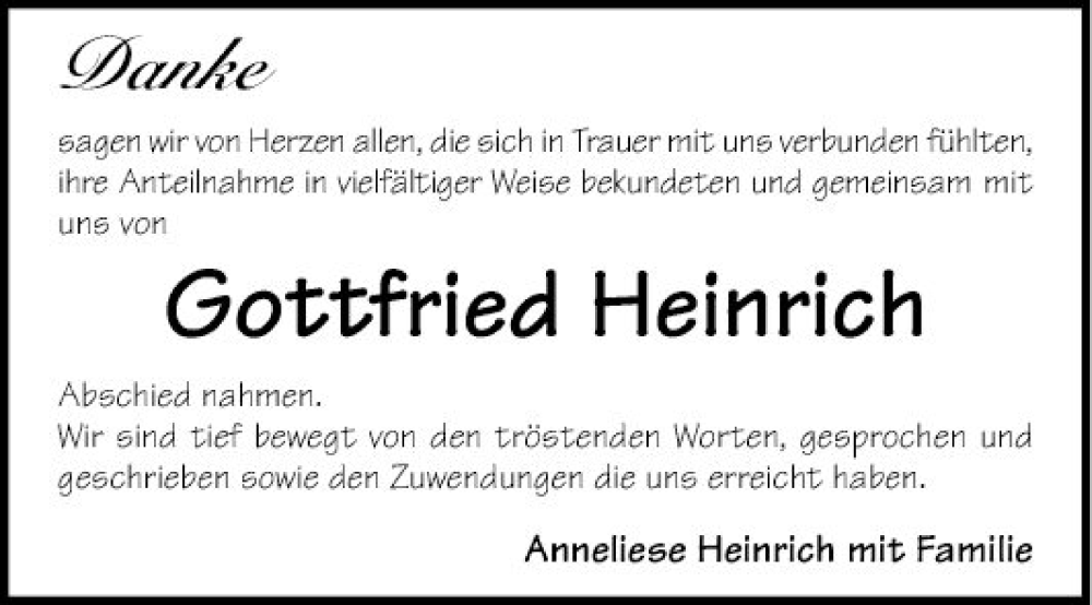 Hier finden Sie alle Traueranzeigen aus der Zeitung, die bisher für Gottfried Heinrich erschienen sind. Weitere Traueranzeigen, die in der Zeitung erscheinen, werden hier ebenfalls aufgelistet