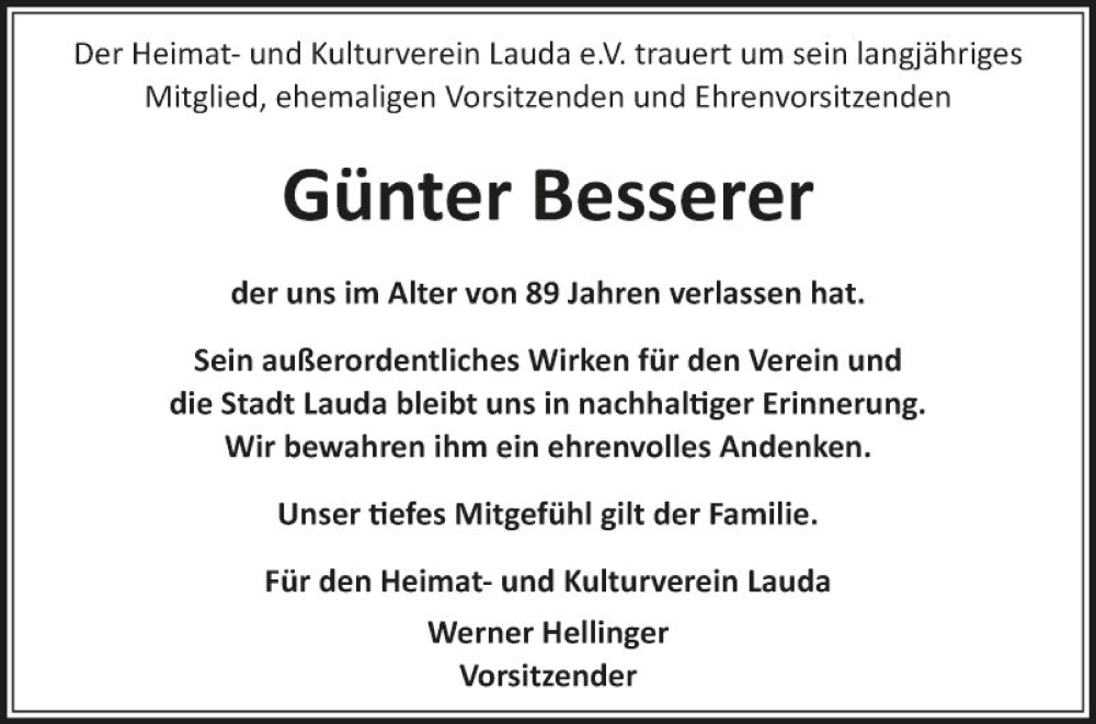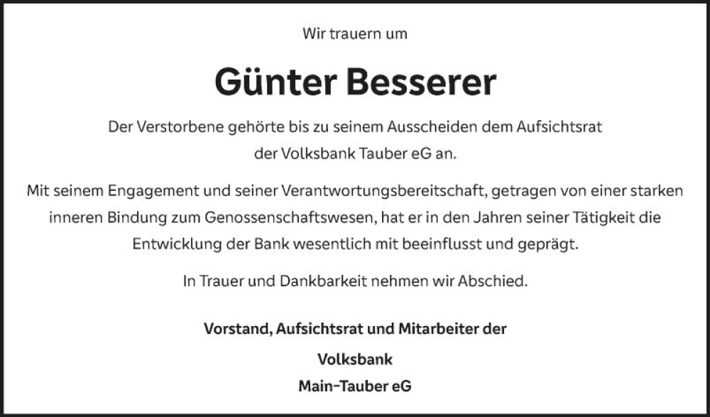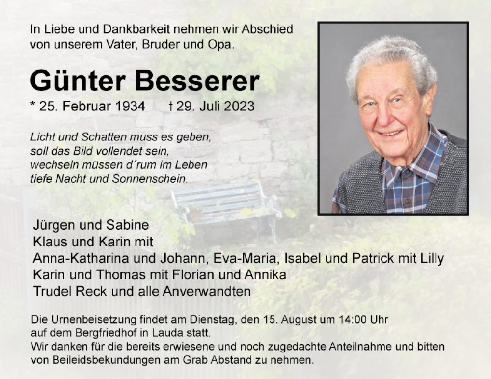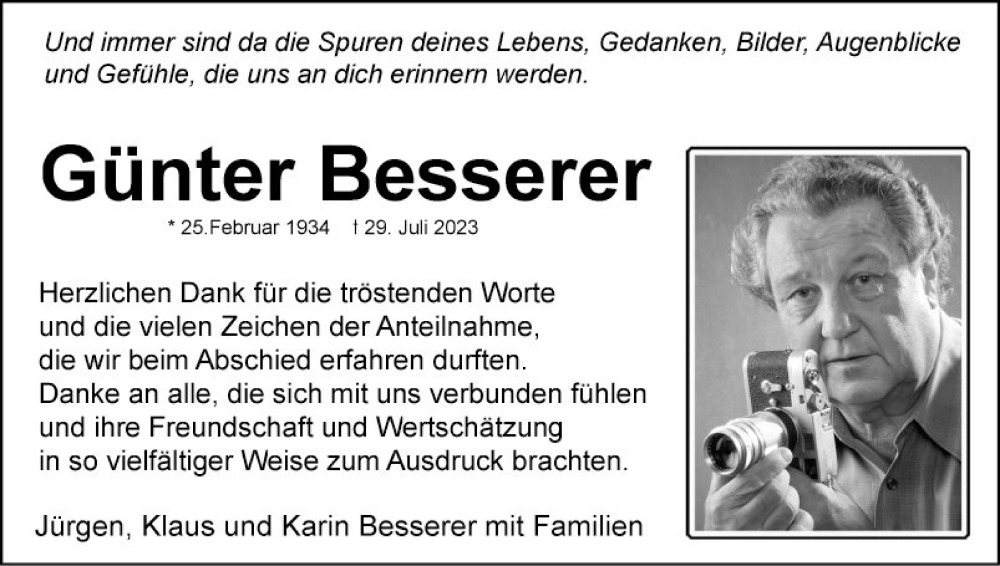 Hier finden Sie alle Traueranzeigen aus der Zeitung, die bisher für Günter Besserer erschienen sind. Weitere Traueranzeigen, die in der Zeitung erscheinen, werden hier ebenfalls aufgelistet