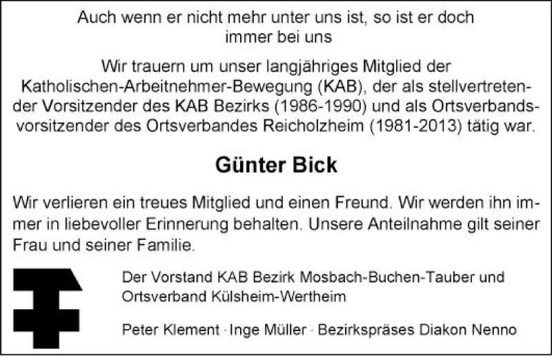 Hier finden Sie alle Traueranzeigen aus der Zeitung, die bisher für Günter Bick erschienen sind. Weitere Traueranzeigen, die in der Zeitung erscheinen, werden hier ebenfalls aufgelistet