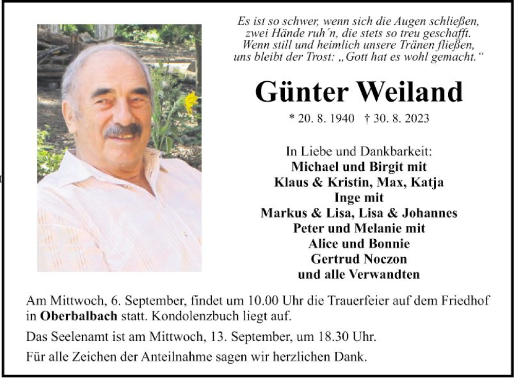 Hier finden Sie alle Traueranzeigen aus der Zeitung, die bisher für Günter Weiland erschienen sind. Weitere Traueranzeigen, die in der Zeitung erscheinen, werden hier ebenfalls aufgelistet