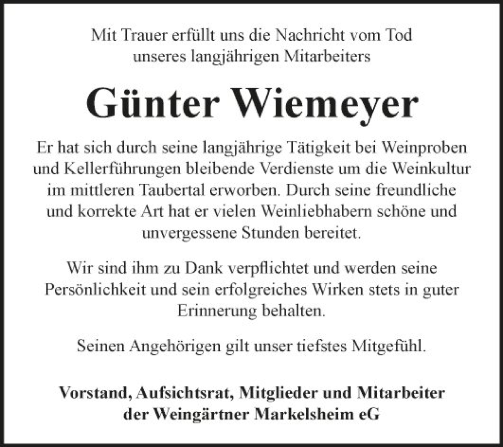 Hier finden Sie alle Traueranzeigen aus der Zeitung, die bisher für Günter Wiemeyer erschienen sind. Weitere Traueranzeigen, die in der Zeitung erscheinen, werden hier ebenfalls aufgelistet