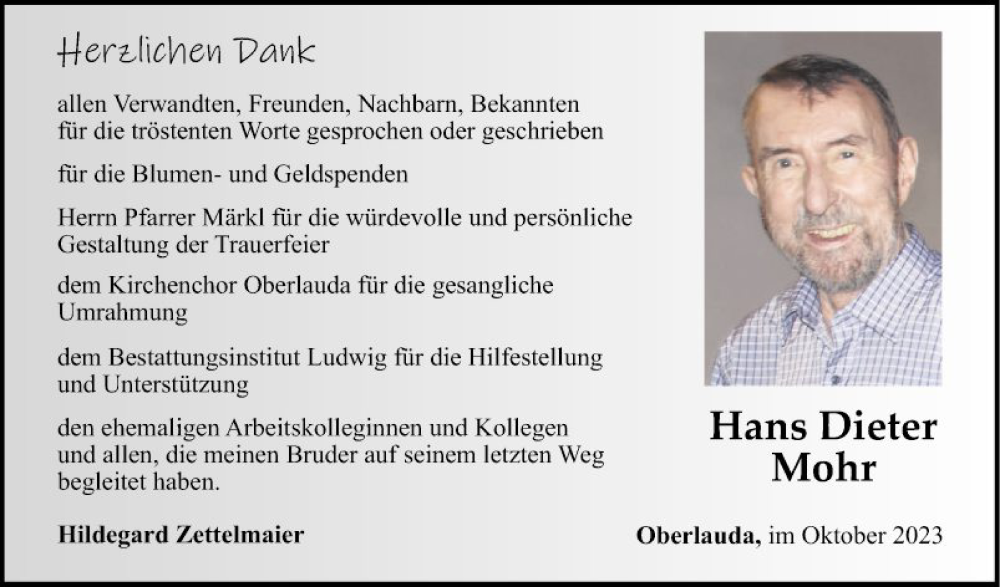 Hier finden Sie alle Traueranzeigen aus der Zeitung, die bisher für Hans Dieter Mohr erschienen sind. Weitere Traueranzeigen, die in der Zeitung erscheinen, werden hier ebenfalls aufgelistet