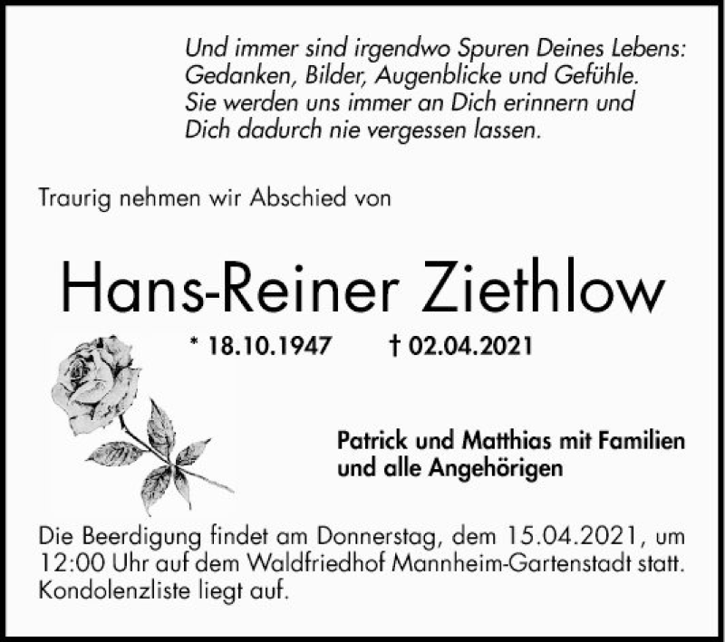Hier finden Sie alle Traueranzeigen aus der Zeitung, die bisher für Hans-Reiner Ziethlow erschienen sind. Weitere Traueranzeigen, die in der Zeitung erscheinen, werden hier ebenfalls aufgelistet