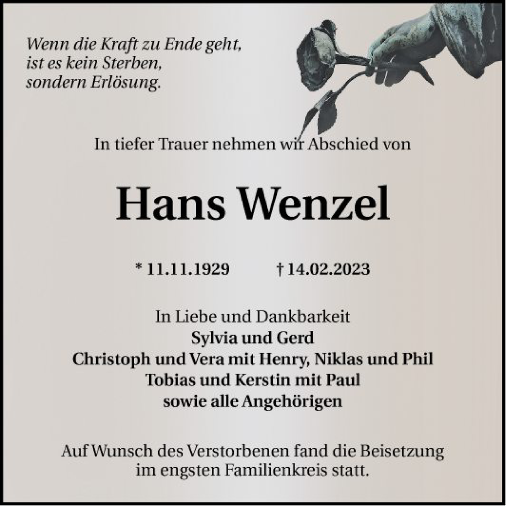 Hier finden Sie alle Traueranzeigen aus der Zeitung, die bisher für Hans Wenzel erschienen sind. Weitere Traueranzeigen, die in der Zeitung erscheinen, werden hier ebenfalls aufgelistet