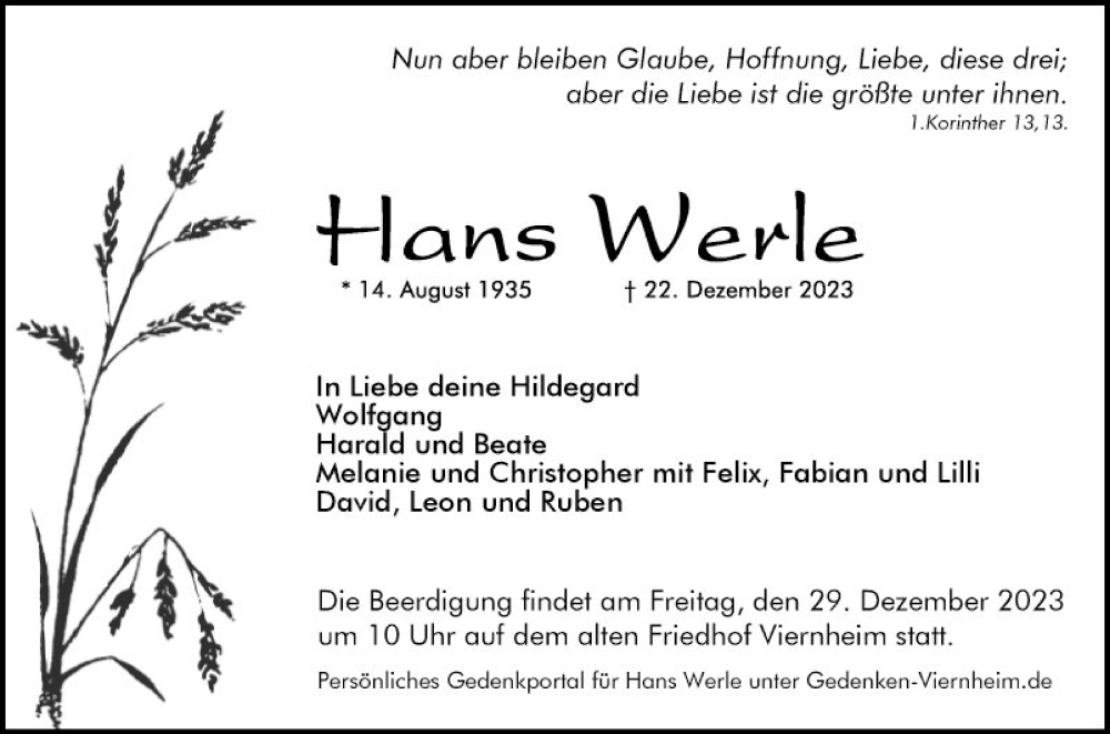 Hier finden Sie alle Traueranzeigen aus der Zeitung, die bisher für Hans Werle erschienen sind. Weitere Traueranzeigen, die in der Zeitung erscheinen, werden hier ebenfalls aufgelistet