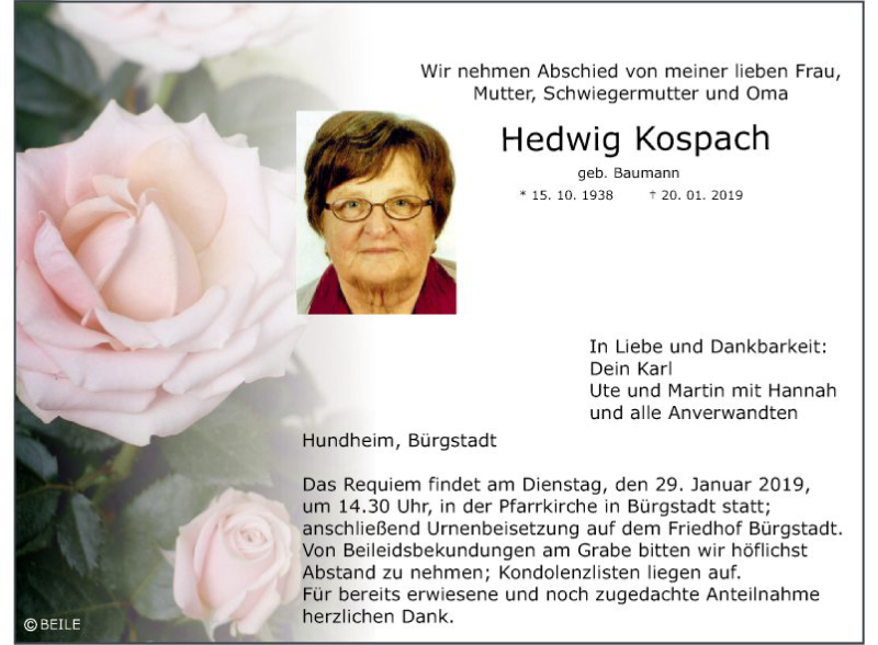Hier finden Sie alle Traueranzeigen aus der Zeitung, die bisher für Hedwig Kospach erschienen sind. Weitere Traueranzeigen, die in der Zeitung erscheinen, werden hier ebenfalls aufgelistet