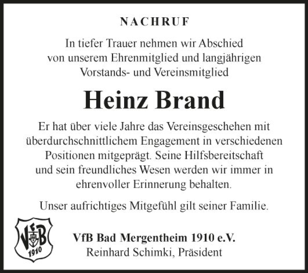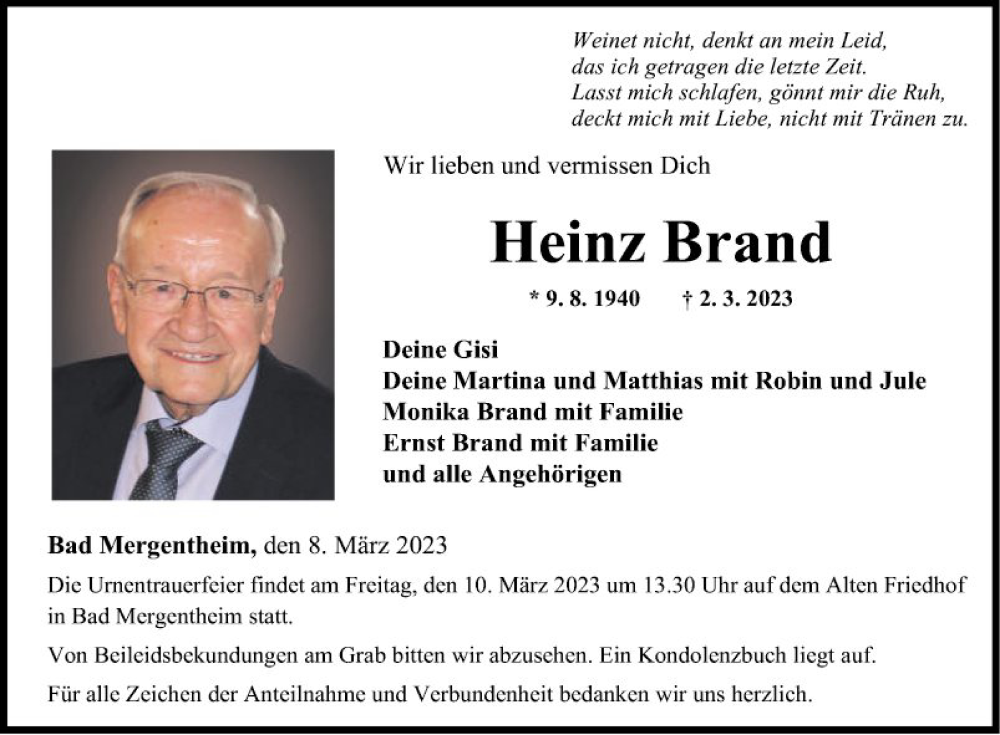 Hier finden Sie alle Traueranzeigen aus der Zeitung, die bisher für Heinz Brand erschienen sind. Weitere Traueranzeigen, die in der Zeitung erscheinen, werden hier ebenfalls aufgelistet