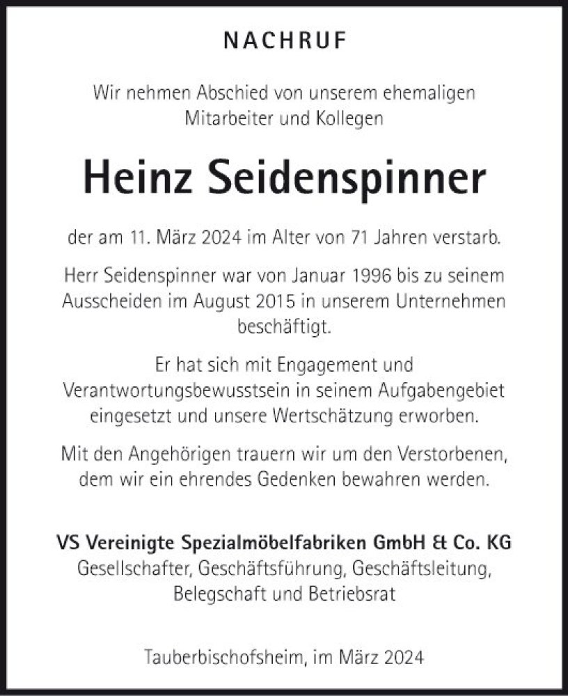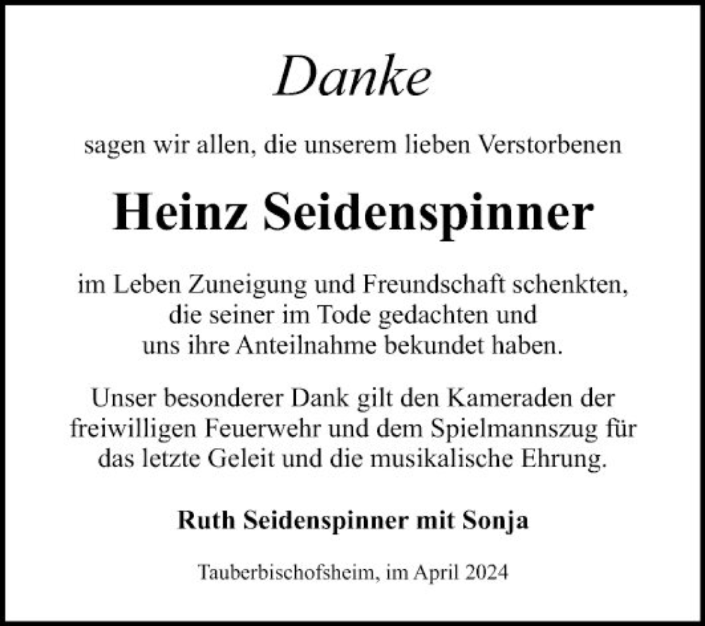 Hier finden Sie alle Traueranzeigen aus der Zeitung, die bisher für Heinz Seidenspinner erschienen sind. Weitere Traueranzeigen, die in der Zeitung erscheinen, werden hier ebenfalls aufgelistet
